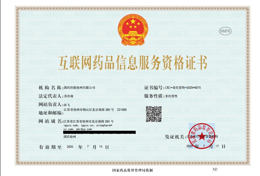 0516-8010-1098 江蘇省徐州市高新技術(shù)開發(fā)區(qū) 北京南路283號萬泰廣場1號樓7-13層 互聯(lián)網(wǎng)藥品信息服務(wù)資格證書